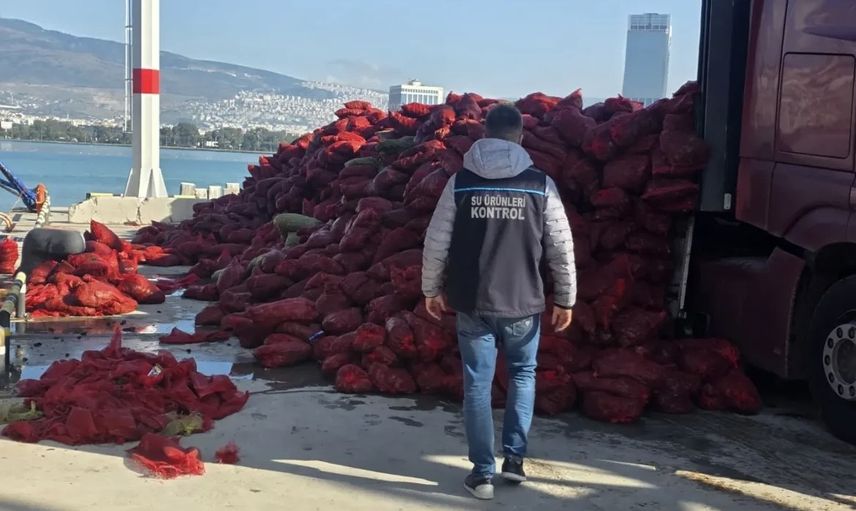 İzmir'de gerçekleştirilen denetimlerde, belli başlı ilçelerde ekiplerin eş zamanlı çalışmasıyla belgesiz olarak kente sokulmak istenen 27 ton kara midye ele geçirildi.