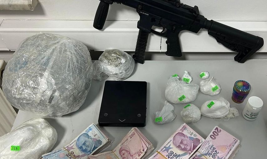 Şüphelilerin saklandığı adreste yapılan aramalarda çeşitli suç unsurları ele geçirildi. Arama sonucunda 1 otomatik silah, 179 fişek, 1 kilogram esrar, 736 gram kokain, 46 uyuşturucu hap, 1 hassas tartı, 114 bin TL ve 1 ABD doları nakit para bulundu.