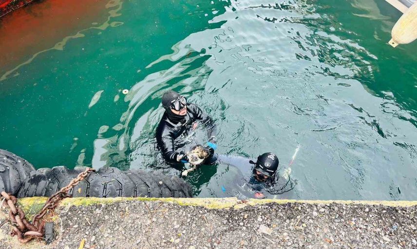 Olay, vatandaşların ihbarı ile başladı ve İzmir İtfaiyesi Su Altı ve Su Üstü Arama Kurtarma Birimi derhal olay yerine intikal etti. Ekipler, hızlı bir şekilde kurtarma çalışmalarına başladı. Mazgaldan düşerek iskele altına giren kediyi kurtarmak amacıyla iki kişilik su altı kurtarma timi suya girerken, diğer iki kişilik ekip botla destek verdi.