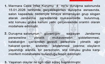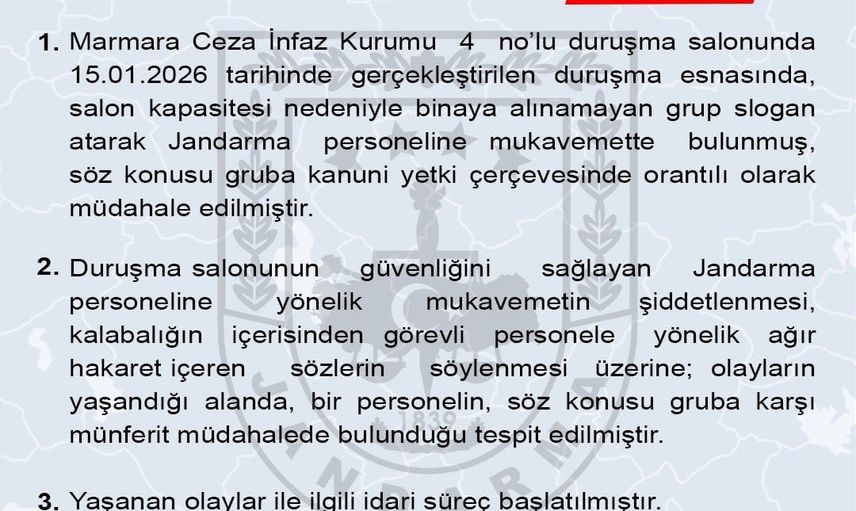 Jandarma Genel Komutanlığı, sosyal medya hesabından yaptığı açıklamada, Marmara Ceza İnfaz Kurumu 4 no’lu duruşma salonunda 15 Ocak Perşembe günü meydana gelen olaylara dair bilgi verdi.