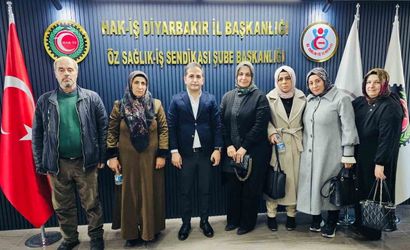Diyarbakır’ın Dicle İlçe Devlet Hastanesinde görev yapan kadın çalışanlar, HAK-İŞ İl Başkanı ve Öz Sağlık İş Şube Başkanı Mehmet Aküzüm’ü ziyaret ederek yoğun emekleri için tebriklerini iletti.