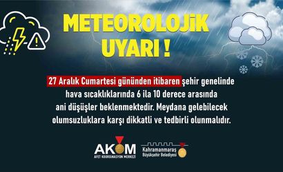 Kahramanmaraş Büyükşehir Belediyesi Afet Koordinasyon Merkezi, 27 Aralık Cumartesi gününden itibaren kent genelinde hava sıcaklıklarının 6 ila 10 derece arasında ani bir düşüş yaşayacağını bildirdi. Bu nedenle vatandaşları dikkatli ve tedbirli olmaları konusunda uyardı.