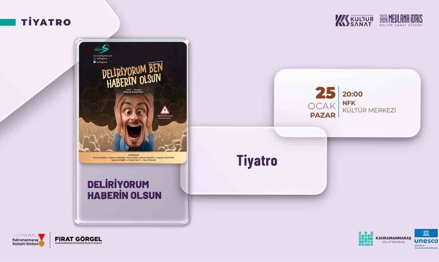 KAHRAMANMARAŞ BÜYÜKŞEHİR BELEDİYESİ, 25 OCAK PAZAR GÜNÜ NFK KÜLTÜR MERKEZİ’NDE “GİZEMLİ YOLCULUK” ADLI TİYATRO OYUNUNU ÇOCUKLARLA, “DELİRİYORUM HABERİN OLSUN” ADLI KOMEDİ GÖSTERİSİNİ İSE YETİŞKİN TİYATROSEVERLERLE BULUŞTURACAK.