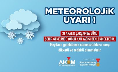 KAHRAMANMARAŞ BÜYÜKŞEHİR BELEDİYESİ BÜNYESİNDE FAALİYET GÖSTEREN AKOM, 31 ARALIK ÇARŞAMBA GÜNÜ ŞEHİR GENELİNDE YOĞUN KAR YAĞIŞI BEKLENDİĞİNİ DUYURDU.