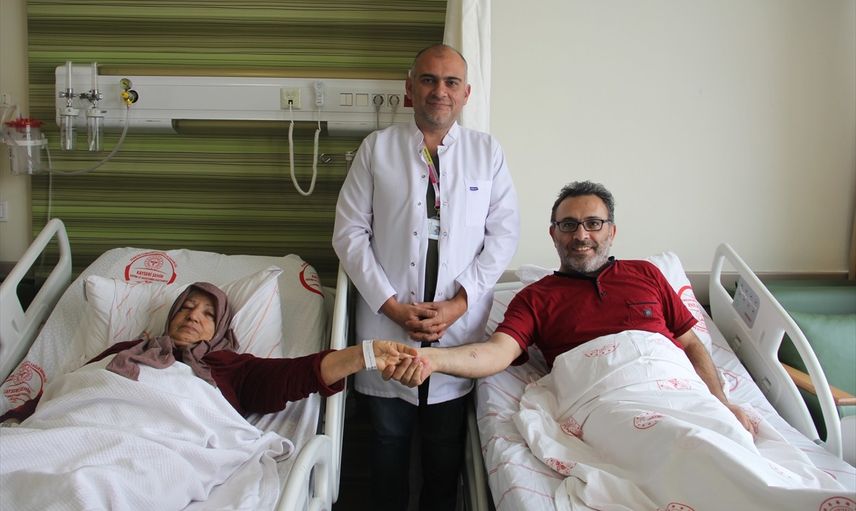 Kayseri'de 5 gün arayla kalp krizi geçiren anne Ayten (sağda) ile oğlu Mehmet Öztemir (ortada), birbirlerinden habersiz gittikleri Kayseri Şehir Hastanesinde aynı gün yapılan anjiyonun ardından sağlıklarına kavuştu.