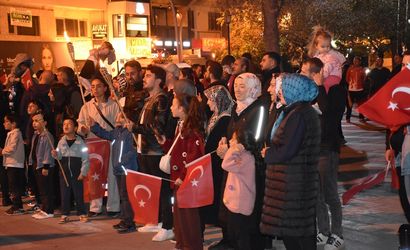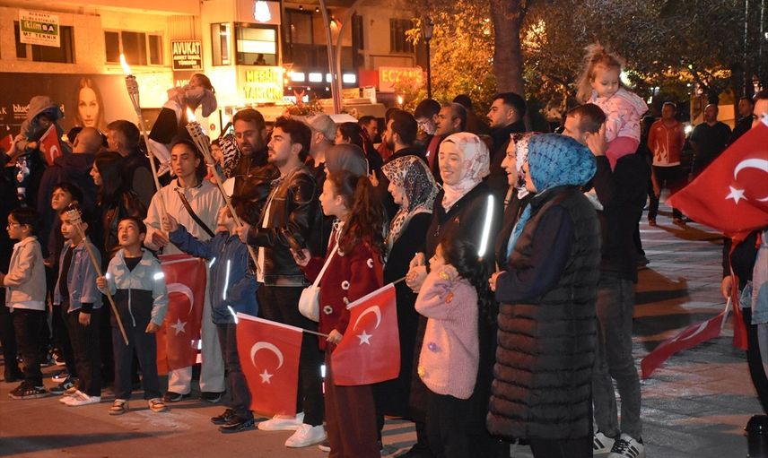 Yürüyüşün ardından meydana ulaşan katılımcılar, Türk bayrakları ve meşalelerle birlikte marşlar söyleyerek bayram coşkusunu paylaştı.