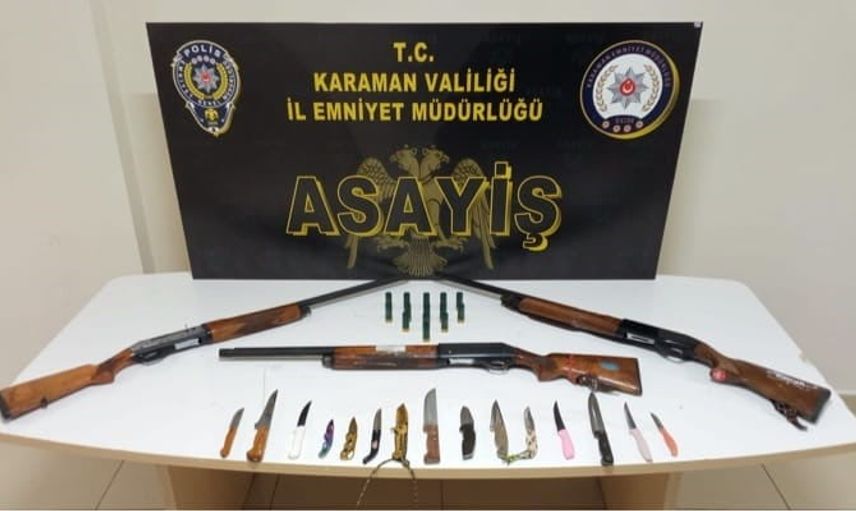 KARAMAN'DA POLİSİN KENT MERKEZİNDE YÜRÜTTÜĞÜ ASAYİŞ UYGULAMALARINDA RUHSATSIZ AV TÜFEKLERİ İLE KAÇAK TÜTÜN ELE GEÇİRİLİRKEN, ARANAN 5 ŞAHIS TUTUKLANDI.