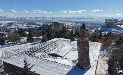 Elazığ’da etkili bir şekilde yağan kar, 1200 rakımlı tarihi Harput Mahallesi'ni beyaza bürüdü.