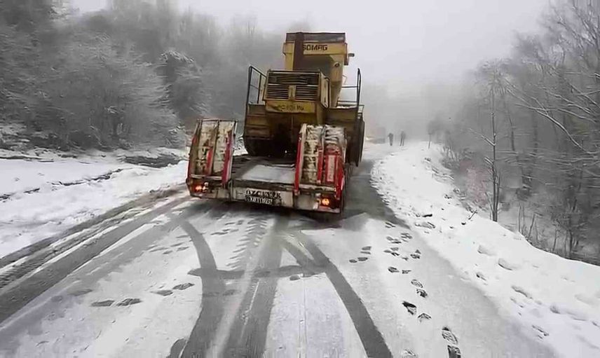 Bartın'da geri dönüşüm tesisine iş makinesi taşıyan bir tır, yoğun kar yağışı sonucu kayarak Bartın-Amasra eski yolunu trafiğe kapattı. Olay, Kazpınarı köyü mevkisinde gerçekleşti.