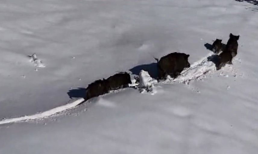 Drone kamerasına yansıyan görüntülerde, yaban domuzlarının kalın kar örtüsü üzerinde ilerledikleri, arada duraksadıkları ve grup halinde hareket ettikleri görüldü. Bir süre sonra sürü, dağlık alanlara yönelerek gözden kayboldu.