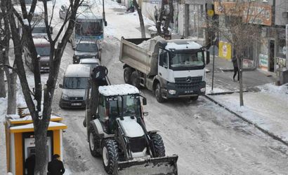Öte yandan, belediye ekipleri caddelerden iş makineleriyle toplanan kar kütlelerini kamyonlara yükleyerek şehir dışındaki boş alanlara taşımaktadır.