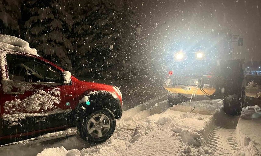 Sarıkamış Özel İdare ekipleri, bölgede sürdürdükleri kar kürüme çalışmaları sırasında mahsur kalan aracı fark etti. Zamanında yapılan müdahale ile halat bağlanarak aracı kar yığınlarından çekmeyi başardılar.
