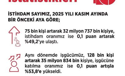 Işıkhan, sosyal medya üzerinden paylaştığı istatistiklerde, istihdam sayısının 2025 yılı Kasım ayında bir önceki aya göre 75 bin kişi artarak 32 milyon 737 bin kişiye ulaştığını belirtti. İstihdam oranının da 0,1 puan artış göstererek yüzde 49,2 seviyesine çıktığını ifade etti.