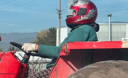 Bolu'da D-100 kara yolunda bir kadın, traktör kullanırken motosiklet kaskı ve eldivenle görüntülendi.