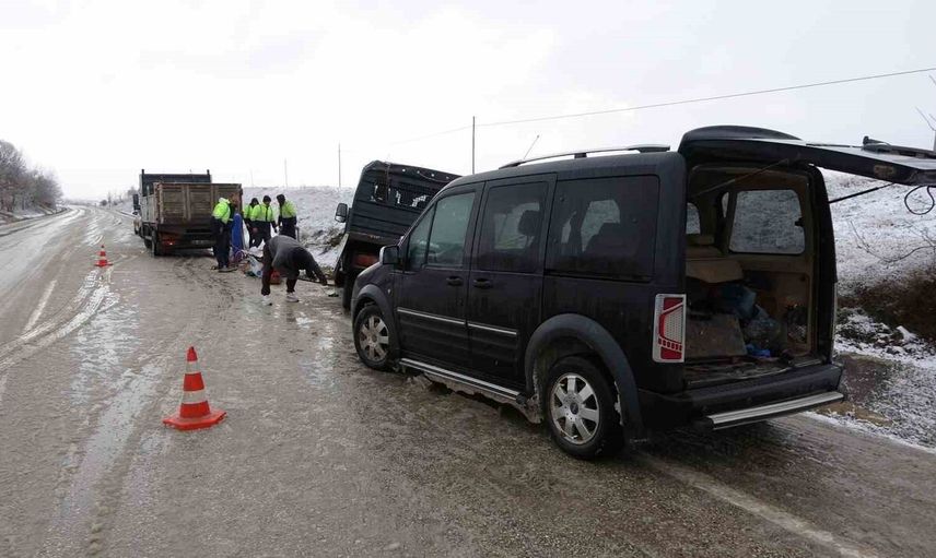Kaza sonrası kamyonetten etrafa saçılan malzemeler başka bir araca yüklendi. Yetkililer, kaza ile ilgili incelemelerini sürdürüyor.