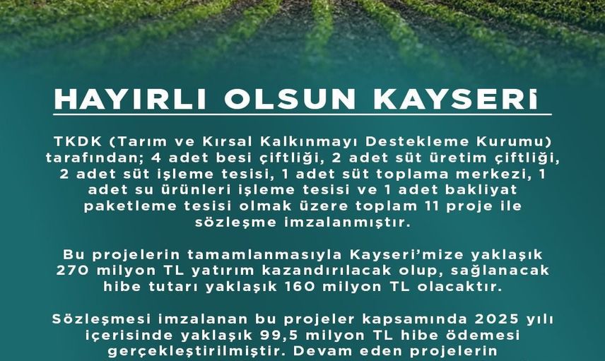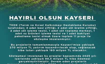 Okandan, yaptığı açıklamada, "TKDK tarafından imzalanan projeler arasında; 4 besi çiftliği, 2 süt üretim çiftliği, 2 süt işleme tesisi, 1 süt toplama merkezi, 1 su ürünleri işleme tesisi ve 1 bakliyat paketleme tesisi bulunmaktadır. Bu projeler tamamlandığında Kayseri’ye yaklaşık 270 milyon TL yatırım kazandırılacak ve sağlanacak toplam hibe tutarının yaklaşık 160 milyon TL olması bekleniyor." dedi.