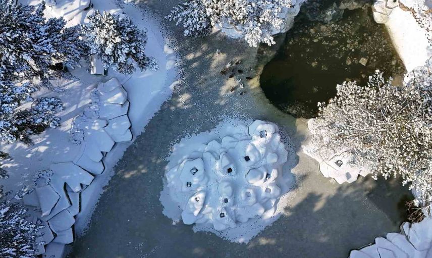 Kayseri’de dün yaşanan kar yağışının ardından, Beştepeler Mesire Alanı’ndaki doğal gölet de soğuk havadan etkilenerek buzla kaplandı. Buz üzerinde dolaşan kaz ve ördekler, muhteşem bir görsel şölen sunarak havadan görüntülendi. Karla kaplı yeşil ağaçlar, bu doğal güzelliğe eşlik etti.