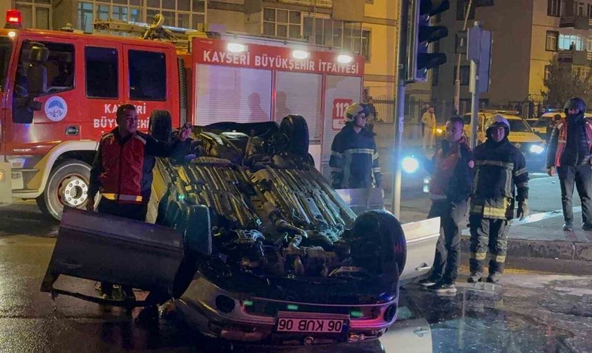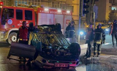 KAYSERİ'DE POLİS EKİPLERİNİN ‘DUR' İHTARINA UYMAYARAK, KAÇAN OTOMOBİL KOVALAMACA SIRASINDA KONTROLDEN ÇIKARAK TAKLA ATTI. KAZA SONRASI ALEV ALAN OTOMOBİL SÖNDÜRÜLÜRKEN, KAÇAN 2 ŞAHIS YARALANDI.