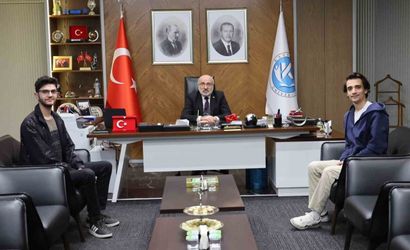 Kayseri Üniversitesi (KAYÜ) Teknik Bilimler Meslek Yüksekokulu Elektronik Teknolojisi Programı'ndan öğrenciler Taha Şaş ve Erdem Özrendeci, Rektör Prof. Dr. Kurtuluş Karamustafa'yı makamında ziyaret etti.