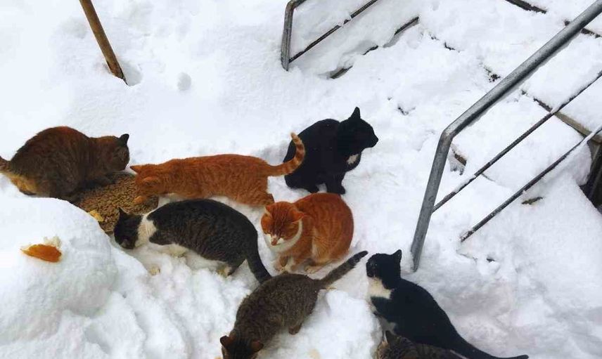 KASTAMONU'NUN ÇATALZEYTİN İLÇESİNDE KÖY İMAMININ SESLENDİĞİ KEDİLERİN SIRALI ŞEKİLDE KARDA YÜRÜMEYE ÇALIŞTIĞI ANLAR KAMERAYA YANSIDI.