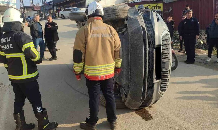 HATAY’DA 2 OTOMOBİLİN ÇARPIŞMASIYLA YAŞANAN TRAFİK KAZASINDA YAN YATAN OTOMOBİLDEKİ 2 KİŞİ YARALANDI.