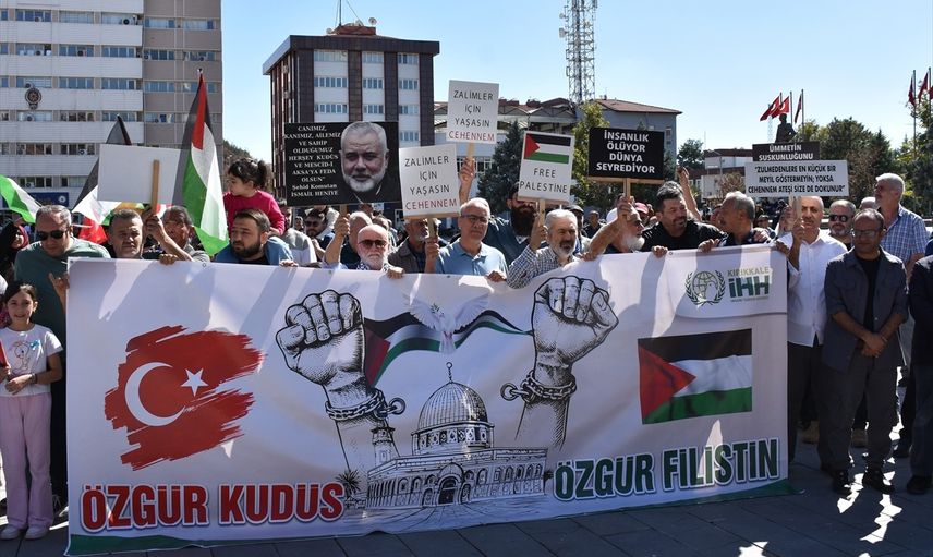 Kırıkkale'de, İsrail'in Gazze'ye yönelik saldırıları protesto edilerek, Küresel Sumud Filosu'na destek verildi. Cumhuriyet Meydanı'nda bir araya gelen sivil toplum kuruluşu üyeleri ile vatandaşlar, ellerindeki Türk ve Filistin bayraklarıyla tekbir getirdi, İsrail aleyhine sloganlar attı.