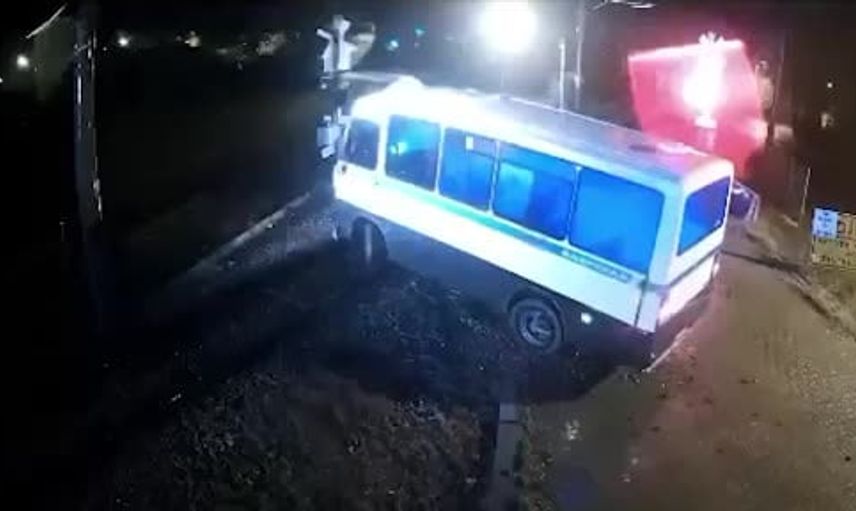 Hemzemin geçitte mahsur kalan dolmuşa tren çarptı, sürücü saniyelerle kurtuldu... Feci kaza kamerada