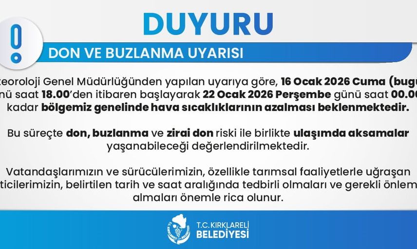 Meteoroloji Genel Müdürlüğü, Kırklareli'de 16 Ocak 2026 Cuma günü saat 18.00'den itibaren hava sıcaklıklarının düşeceğini duyurdu. Bu soğuk hava dalgasının, 22 Ocak 2026 Perşembe günü saat 00.00'a kadar etkili olacağı bildiriliyor.