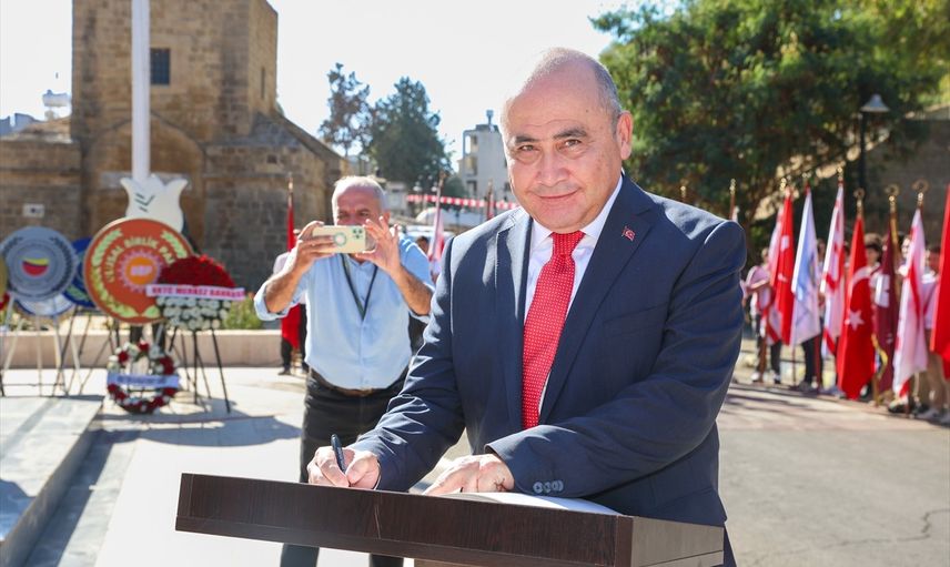 Tören, protokol sırasında anıta çelenklerin sunulmasıyla başladı. Saygı duruşu ve İstiklal Marşı eşliğinde bayrakların göndere çekilmesinin ardından, Cumhurbaşkanı Tufan Erhürman ve Büyükelçi Ali Murat Başçeri Anıt Özel Defteri’ni imzaladı.