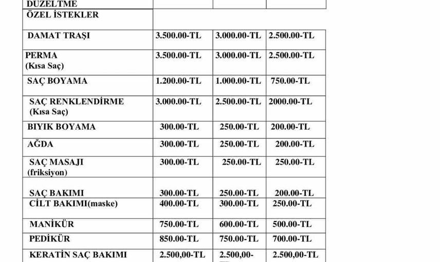 Yeni tarifeye göre, lüks sınıf berberlerde saç kesimi 700 TL, A sınıfında 400 TL, ve B sınıfında 300 TL olarak uygulanacak. Ayrıca modelli saç kesimi için lüks sınıfta 800 TL, A sınıfında 600 TL, B sınıfında ise 400 TL fiyat belirlendi.