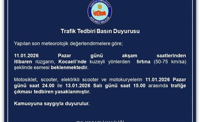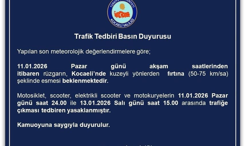 Kocaeli Valiliği, 11 Ocak 2026 tarihinde etkili olması beklenen fırtına nedeniyle motosiklet, scooter, elektrikli scooter ve motokuryelerin trafiğe çıkmasının yasaklandığını duyurdu.