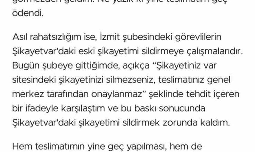Olayı ifade eden şahıs, "Katılım Evim İzmit şubesinin önceki teslimat sürecinde ciddi sıkıntılar yaşamıştım ve bunu 'Şikayetvar' üzerinden aktardım. Yine de iyi niyetle hareket edip, aynı şube üzerinden yeni bir ödemeye katıldım. Ancak, yine teslimatım geç yapıldı. Daha da rahatsız edici olan, şube çalışanlarının eski şikayetimi silmek için baskı kurmalarıdır. Bugün şubeye gittiğimde, açıkça 'Şikayetinizi silmezseniz, teslimatınız genel merkez tarafından onaylanmaz' şeklinde bir tehdit ile karşılaştım. Bu baskı neticesinde, şikayetimi sildirmek zorunda kaldım. Hem teslimatın gecikmesi, hem de şikayetimi silmem için baskı görmem son derece rahatsız edici ve güven sarsıcı.