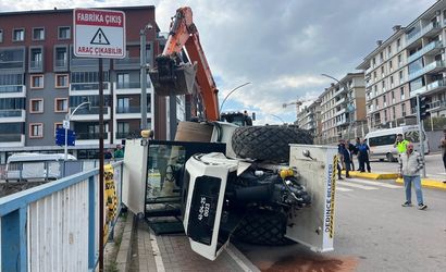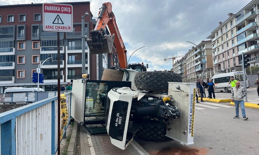 Kocaeli'nin Derince ilçesinde dikkat çeken bir kaza meydana geldi. Seyir halindeki bir tırın üzerinden yola devrilen iş makinesi, yaralanmalara yol açtı.