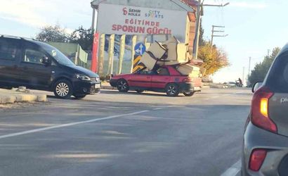 Eskişehir’in Yenikent Mahallesi Zümrüt Caddesi’nde, otomobilinin üzerine koltuk takımı yükleyen bir sürücü dikkatleri üzerine çekti. Bu olay, trafikte güvenliği tehdit eden bir durum oluşturdu.