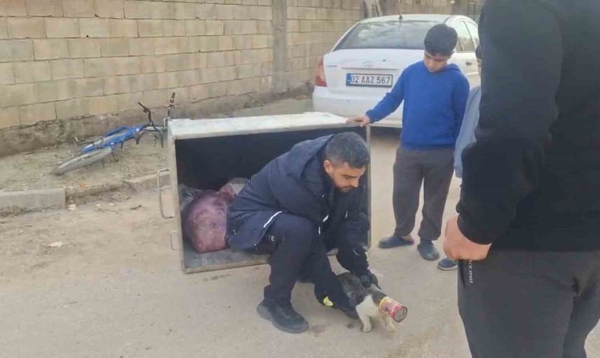 Adıyaman Belediyesi İtfaiye Müdürlüğü ekipleri, kent merkezinde konserve kutusuna sıkışan bir kediye müdahale etti. Olay, duyarlı vatandaşların durumu bildirmesiyle başladı.