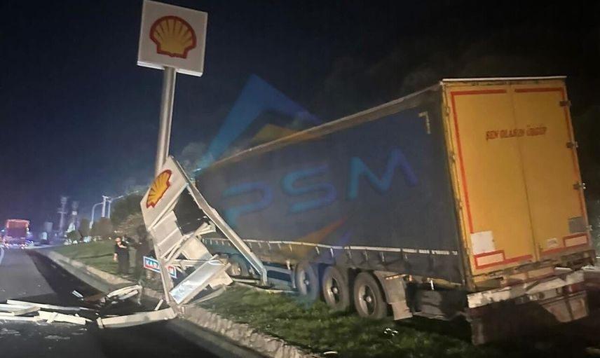Sakarya'nın Geyve ilçesinde, D-650 kara yolunda kontrolden çıkan bir tır, öncelikle yön tabelasına çarptı ve ardından bir akaryakıt istasyonuna girdi.