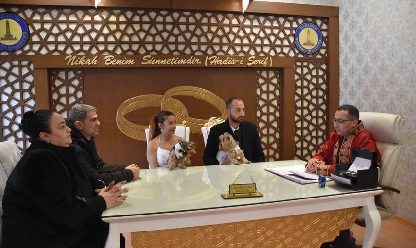GAZİANTEP’TE HAYATLARINI BİRLEŞTİREREK DÜNYA EVİNE GİREN DİLEK ÖZTÜRK İLE HAKAN ÖZBEK, GELİNLİK VE DAMATLIK GİYDİRDİKLERİ KÖPEKLERİYLE BİRLİKTE MUTLULUĞA "EVET" DEDİ.