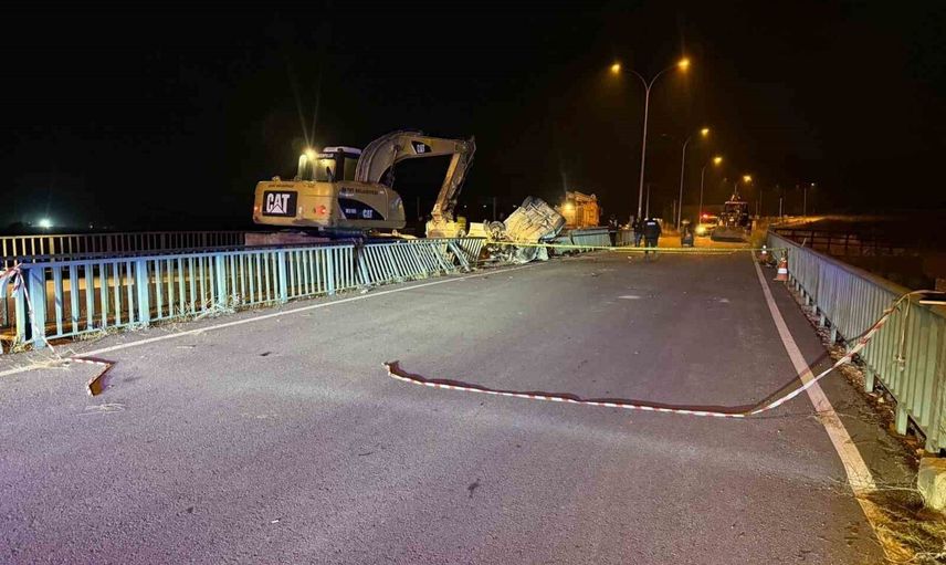 Kazanın etkisiyle hurdaya dönen otomobil, bölgeye gelen iş makinesi tarafından devrildiği köprü demirlerinin üzerinden kaldırıldı.