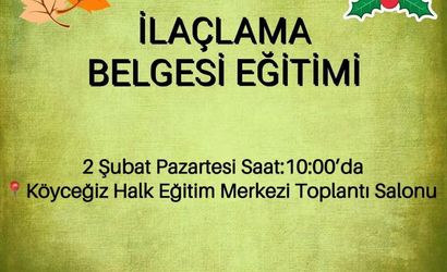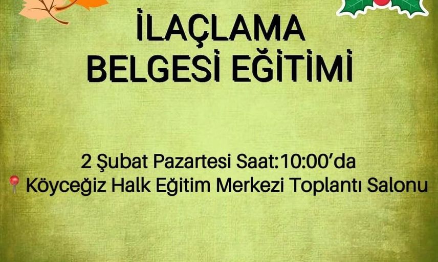 Köyceğiz İlçe Tarım ve Orman Müdürlüğü, çiftçilere yönelik ilaçlama belgesi eğitimi düzenliyor. Bu kapsamda yapılan açıklamada, "Değerli üreticilerimiz, 2 Şubat Pazartesi günü saat 10.00’da Köyceğiz Halk Eğitim Merkezi toplantı salonunda ilaçlama belgesi eğitimi yapılacaktır. Daha önce alınan belgeler geçerlidir. Belgesi olmayan üreticilerimizin eğitime 1 adet fotoğraf ile katılması ilan olunur." ifadeleri yer aldı.