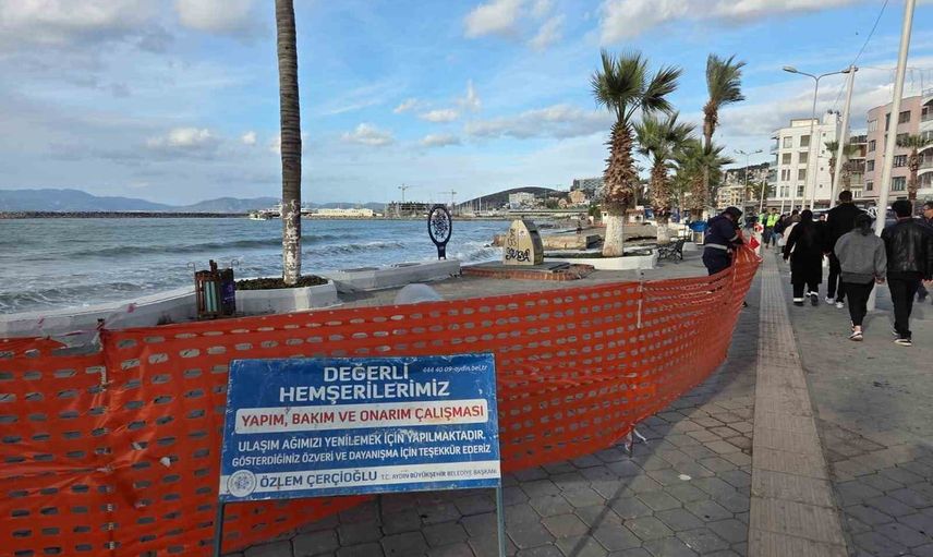 Aydın Büyükşehir Belediyesi Fen İşleri Dairesi Başkanlığı ekipleri, sahil şeridinde gerekli güvenlik tedbirlerini alarak düzenleme ve onarım faaliyetlerini yürütmektedir.