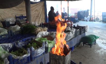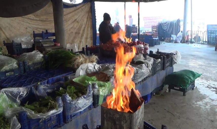 Kütahya'da sert kış koşulları, pazarcı esnafını olumsuz etkiliyor. Tezgahlarının kenarlarında tenekelerde ateş yakarak ısınmaya çalışan esnaf, bu yöntemi mecburi hale getirdiklerini belirtiyor.