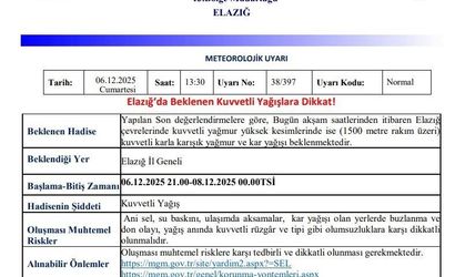 Açıklamada, "Yapılan son değerlendirmelere göre, bugün akşam saatlerinden itibaren Elazığ, Bingöl, Malatya, Adıyaman ve Tunceli çevrelerinde kuvvetli yağmur beklenmektedir. Yüksek kesimlerde (1500 metre rakım üzeri) ise karla karışık yağmur ve kar yağışı olacağı tahmin edilmektedir," denildi.