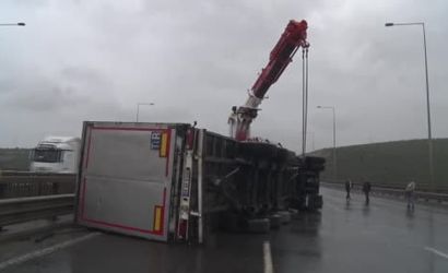 Kuzey Marmara Otoyolu'nda şiddetli fırtına nedeniyle iki tır devrildi