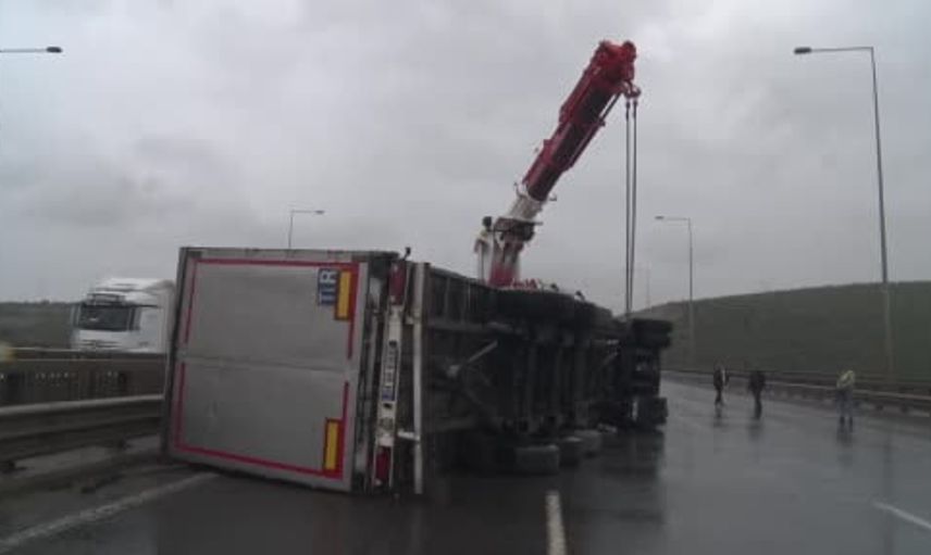 Fırtınanın etkisiyle seyir halinde olan iki tır, ciddi rüzgardan dolayı uçarak devrildi. Olayın hemen ardından, güvenlik açısından jandarma ve otoyol ekipleri hızlıca bölgeye sevk edildi.