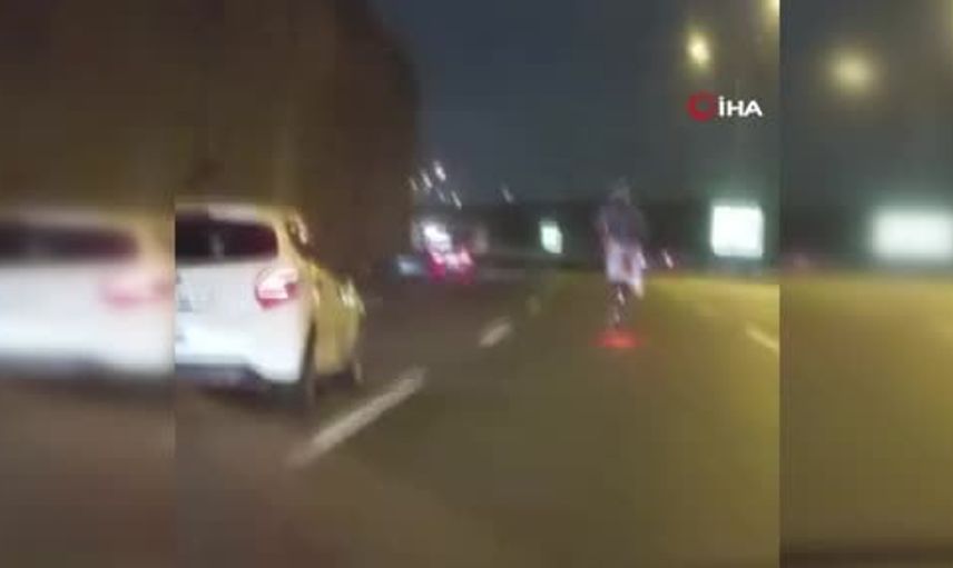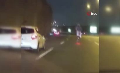 Bu tehlikeli anlar, diğer sürücüler tarafından cep telefonlarıyla kaydedildi. Olay, dünkü gece saatlerinde, kuzey Marmara Otoyolu'nun Cebeci Tüneli mevkiinde gerçekleşti.