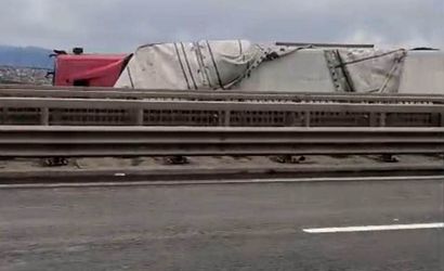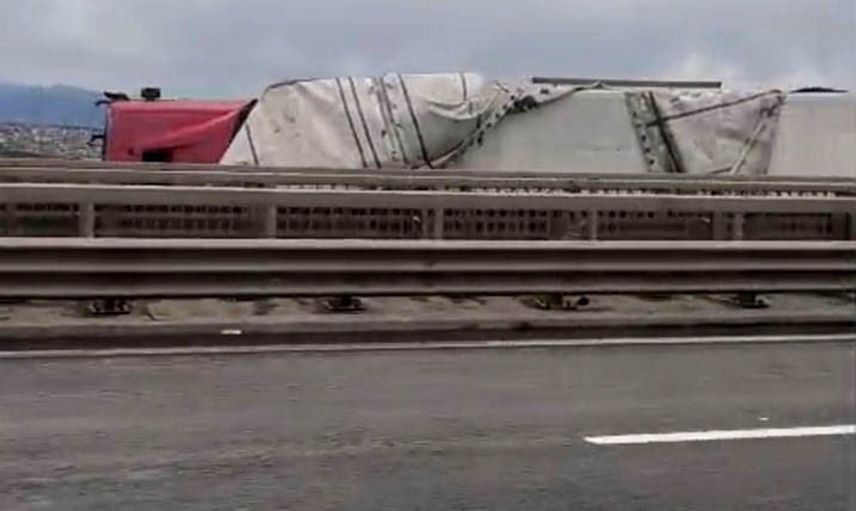 Kuzey Marmara Otoyolu’nun Dilovası ilçesi geçişinde seyahat eden 2 tır, yoğun rüzgar etkisiyle kontrolden çıkarak devrildi.