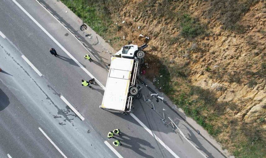 Eyüpsultan'da, Kuzey Marmara Otoyolu üzerinde iki kamyon ve bir tırın karıştığı bir zincirleme trafik kazası yaşandı. Olayda, aynı şirkete ait olan iki kamyondan biri diğerine çarparak devrildi.