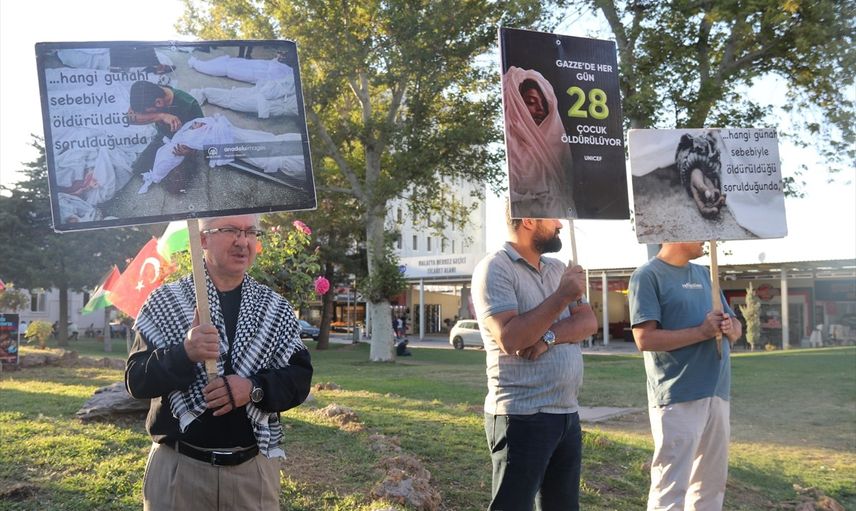 Malatya'da bir grup öğretmen, İsrail'in Gazze'de yaptığı soykırıma dikkati çekmek için 1,5 yıldır "sessiz eylem" yapıyor. Grup, üzerinde "Gazze'nin ve Sumud Filosu'nun yanındayız", "Gazze'nin yetimlerini yalnız bırakma" ve "Gazze'de soykırım devam ediyor" yazılı pankart, döviz ve fotoğraflarla İsrail'in Gazze'deki saldırılarına karşı farkındalık oluşturmaya çalışıyor.