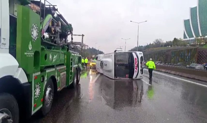 MALTEPE'DE YAĞMURUN ETKİSİYLE KAYGANLAŞAN YOLDA HAVALİMANI PERSONELİNİ TAŞIYAN SERVİS MİNİBÜSÜ DEVRİLDİ