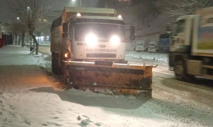Mardin’de etkili olan kar yağışının ardından, Büyükşehir Belediyesi ekipleri, kent genelinde karla mücadele çalışmalarını gece boyunca aralıksız sürdürdü.